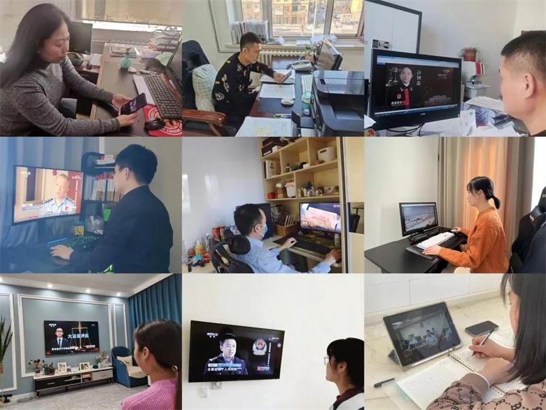 无论是居家办公的干警,还是在卡口执勤的志愿者,或是坚守岗位的法官,大家通过电视直播、手机APP直播等方式观看节目。在节目播放的过程中,干警们仔细观看学习,并不时记录学习心得。共同体会大法官的初心为民,以及为实现“努力让人民群众在每一个司法案件中感受到公平正义”所付出的艰辛。