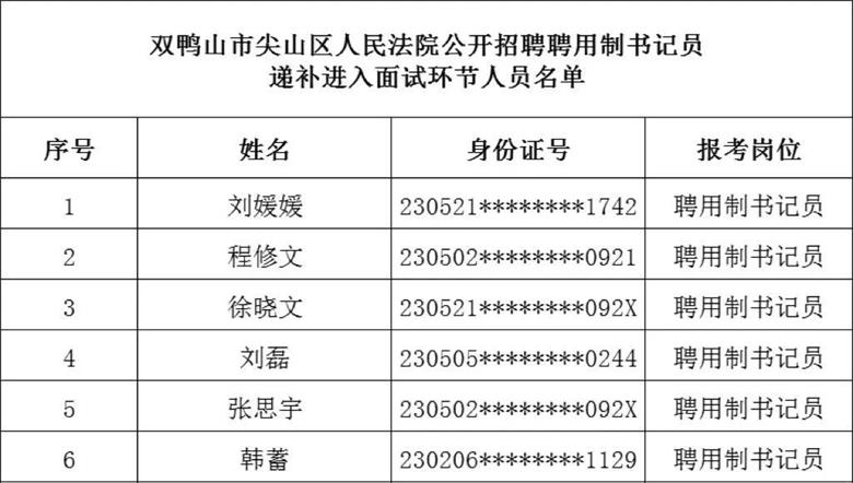 按照《双鸭山市尖山区人民法院2023年公开招聘聘用制书记员公告》,我院聘用制书记员岗位职数空缺2人,现进行聘用制书记员岗位递补工作。按照笔试成绩从高到低顺序以1:3比例确定递补进入面试环节资格。现将递补进入面试环节人员名单公布及相关事宜通知如下: