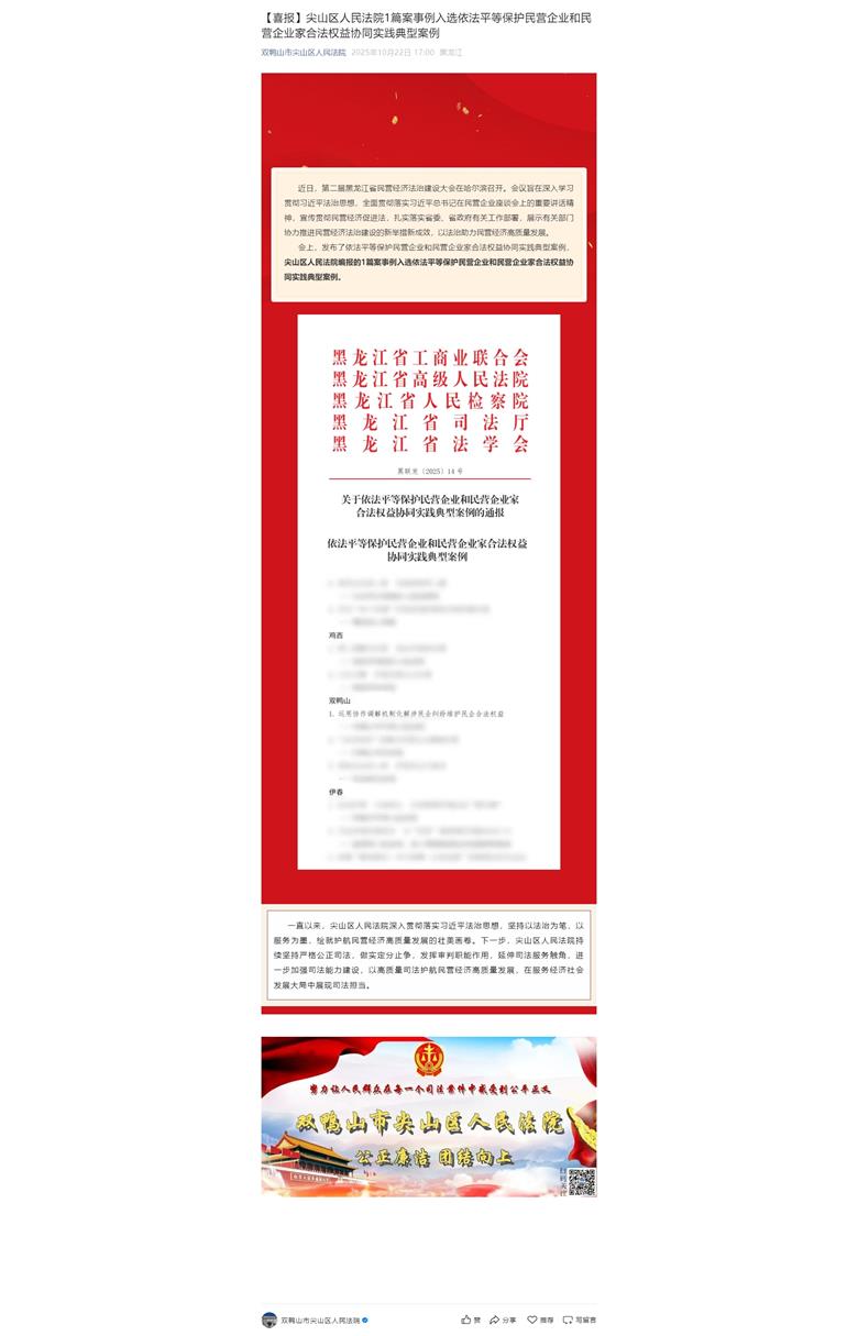【喜报】尖山区人民法院1篇案事例入选依法平等保护民营企业和民营企业家合法权益协同实践典型案例