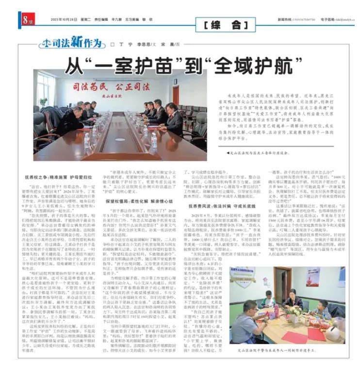 10月28日,《人民法院报》第08版《综合》版面以《从“一室护苗”到“全域护航”》为题,报道尖山区人民法院未成年人司法保护工作。