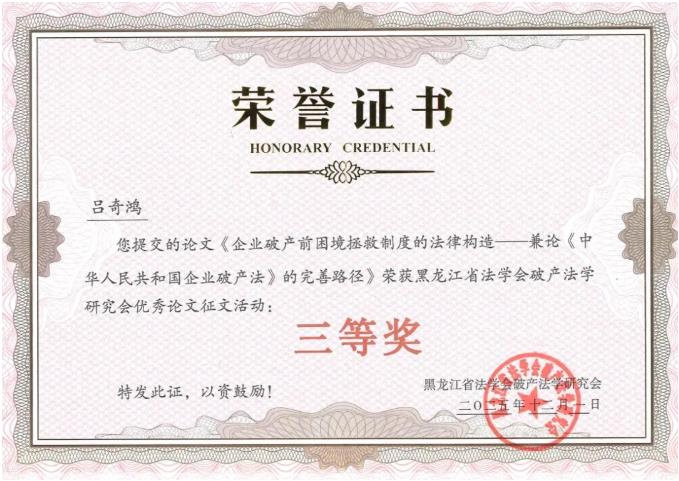 近日,黑龙江省法学会破产法学研究会为深入贯彻习近平法治思想,以“赋能龙江经济转型发展,聚焦破产法学前沿研究”为主题面向学术界、实务界公开征文评选结果正式揭晓。