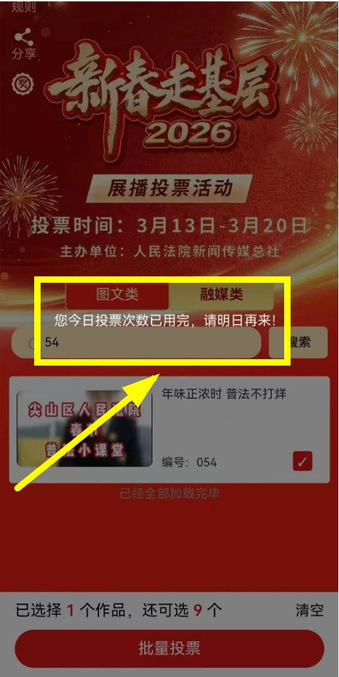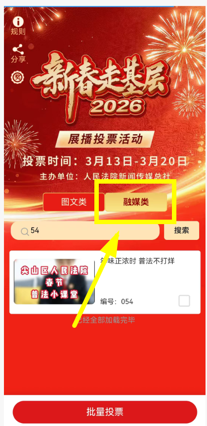 3.选择“融媒类”板块,搜索编号“54”即可投票,每人每日可投10票,直至出现如下界面即可