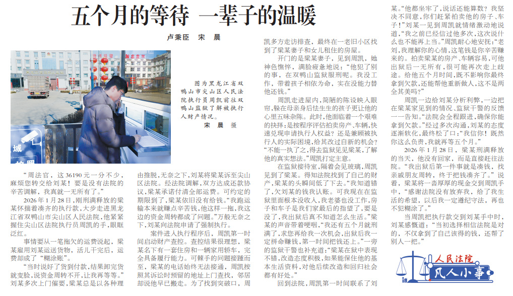 2026年1月28日,刚刑满释放的梁某怀揣着凑齐的执行款,大步走进黑龙江省双鸭山市尖山区人民法院,他紧紧握住尖山区法院执行员周凯的手,眼眶泛红。