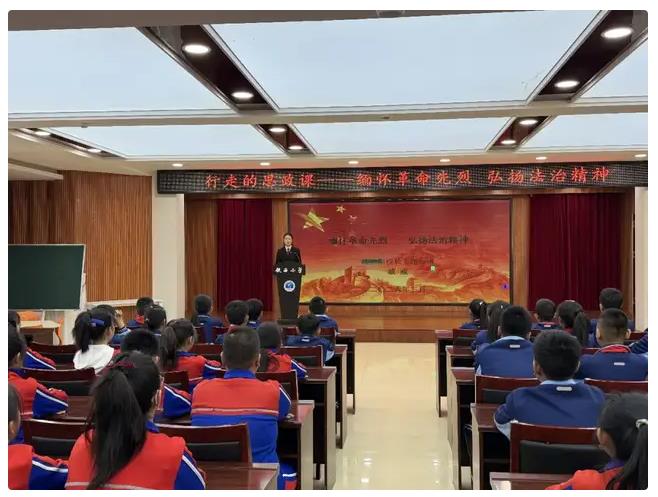 活动现场,全体少先队员整齐就座,面向国旗庄严敬礼,用标准的队礼表达对革命先烈的崇高敬意与爱国热忱。课堂上,法治副校长戚威以革命先烈的英勇事迹为切入点,深情讲述先烈们为民族独立、人民解放抛头颅、洒热血的奋斗故事,引导同学们铭记历史、缅怀先烈,珍惜当下来之不易的幸福生活。她紧扣主题,将革命先辈追求公平正义、坚守信仰信念的精神内核与新时代法治精神深度融合,深入浅出地阐释法治的深刻内涵,让同学们明白法治是国家安定、社会和谐、人民幸福的重要保障,更是对革命先烈精神的最好传承。